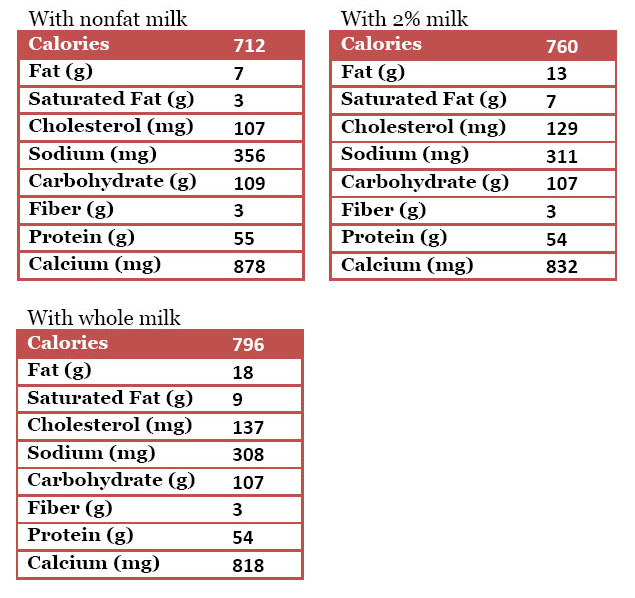• 1  1/2 cups nonfat, 2% or whole milk (or milk substitute of your choice)